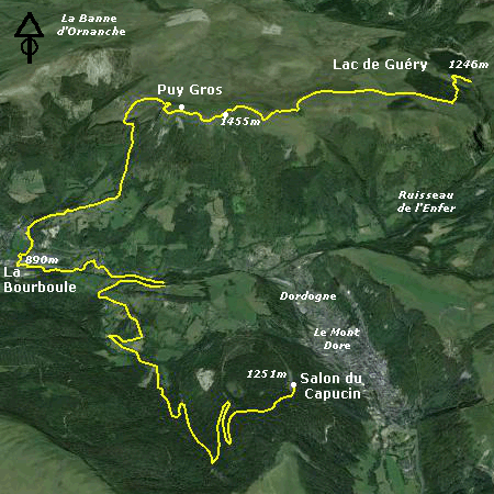 Nous démarrons du Capucin, dôme acide datant de -0.8Ma, édifice faisant partie intégrante du massif du Sancy. En traversant la Dordogne à la Bourboule, nous quittons à la fois le massif du Sancy et la caldeira du mont Dore, issue de la grande éruption "initiale" datant de -3Ma. Le Puy Gros et la Banne d'Ornanche sont rattachés à un groupe volcanique bien distinct du Sancy, actif entre -2Ma et -1.5Ma, et avec des laves (trachyandéiste) différentes de celles du Sancy. Le lac de Guéry est quant à lui un petit lac de surcreusement glaciaire, creusé dans un dépôt de cendres stratifiées (cinérite).