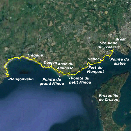 Temps un peu gris au démarrage, ensoleillé à midi, et soleil voilé dans l'après-midi : c'est la météo pour cette étape qui nous fait longer le goulet de Brest jusqu'à la pointe du petit Minou, la mer d'Iroise ensuite, sur des falaises couvertes de fougères. Dans la première partie, de nombreux grands arbres, notamment des pins, poussent sur la falaise. Ils se font plus rares ensuite. Nous touchons presque du doigt la presqu'île de Crozon, alors qu'il faut plusieurs jours de marche pour l'atteindre. Nous découvrons de nombreux forts, datant de Vauban, mais réarmés par la suite et notamment par les allemands pendant la seconde guerre mondiale. Nous passons par Déolen, d'où partaient dès 1879 et jusqu'aux années soixante des câbles transatlantiques, dont des débris jonchent l'anse.