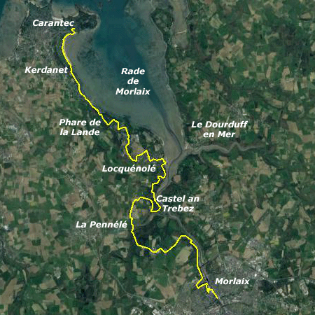 Cette étape nous emmène le long de la baie de Morlaix ; nous alternons entre le bord de la baie, les falaises qui la dominent avec leurs cultures d'artichauts, et la traversée d'affluents de la rivière de Morlaix. Finalement, un dénivelé significatif pour une balade sur le sentier côtier ! Nous découvrons le phare de la Lande, au milieu des champs. En passant à Locquénolé, le site Pages Jaunes nous apprend qu'il y a un restaurant à 628m... Mais c'est au Dourduff, de l'autre côté de la baie ! Après avoir fait le tour du site de Castel an Trebez et son imposante muraille de terre, nous descendons au fond de la vallée boueuse du Pennélé avant de rejoindre les bords de la rivière de Morlaix qui nous conduisent dans la ville.