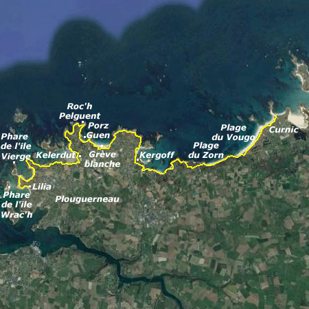 Le soleil est au rendez-vous pour cette étape. La matinée est agréable et variée ; nous démarrons avec la perspective des phares de l'île Wrach et de la Vierge, parait-il le plus haut d'Europe avec ses 82.50m. Nous poursuivons le long d'une agréable côte rocheuse ponctuée de plages de sable blanc. Pour la traversée de Kergoff, nous perdons la vue sur la mer à cause des murs des propriétés privées et trouvons le bitume ; ensuite une haute haie de fougères destinée à protéger du vent bouche souvent la vue, que nous retrouvons au dessus des plages dominant Curnic.
