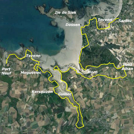 L'originalité de cette étape, c'est que nous passons l'essentiel de la journée à contourner deux embouchures, celles du Guillec et celle de l'Horn, pour nous retrouvons à deux pas du point de départ. Nous descendons ainsi le Guillec à marée basse et le remontons avec la marée presque haute. Nous faisons le grand tour de l'mbouchure de l'Horn ; peut-être aurions-nous dû couper par le pont à marée, car la fin n'a pas de grand intérêt, surtout en rive gauche. Les bords du ruisseau sont tapissées de ce qui ressemble à une feuille de platique, en fait des algues, sèches seulement à l'extérieur.... une vraie patinoire ! Nous retrouvons ensuite la côte, avec son alternance de plages de sable blanc et de zones rocheuses.