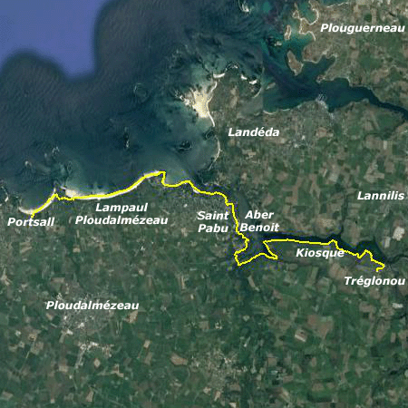 Nous démarrons de Portsall avec un temps bizarre : couvert, lourd, chaud et humide, parfois avec un léger brouillard. Mais les choses s'arrangeront vers midi, avec un léger vent qui se charge de faire le ménage.... Nous profitons de la marée descendante pour suivre la grève jusqu'au port de Saint-Pabu, par une longue plage limitée par un trait de dunes. A Saint-Pabu, hélas, il nous faut emprunter le bitume pour contourner les propriétés privées. Il semblerait que l'obligation de servitude de passage sur le littoral ne s'applique pas dans les zones urbanisées et le long des abers. C'est bien dommage... Nous longeons ensuite l'aber Benoît par un sentier très agréable, sous une rangée de chênes. Nous passons par un curieux kiosque qui domine l'aber, avant de rejoindre Tréglonou, où se trouve le pont.