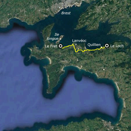 Nous démarrons du Fret avec un ciel bas ; néanmoins, il fait chaud ! Après avoir tenté d'identifier quelques points géologiques remarquables, nous longeons la falaise dans les fougères et les chênes jusque Lanvéoc ; là, nous nous écartons de la mer pour contourner une base militaire ; nous rejoignons une nouvelle fois le rivage près de l'école navale dont l'architecture n'est pas vraiment en adéquation avec la beauté de la presqu'île ; nous apercevons les immenses hangars de la base de sous-marins de l'île Longue. Notre pique-nique est troublé par les bruits des hélicoptères qui réalisent sous nos yeux des exercices d'hélitreuillage. Nous reprenons notre chemin le long d'un falaise d'une dizaine de mètres, toujours à couvert mais cette fois d'une forêt de pins. A l'approche de Quillien, le ciel se dégage et nous offre un magnifique point de vue vers la rade de Brest et l'aber du Loch.