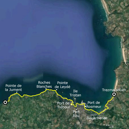 Chaleur étouffante aujourd'hui. L'étape suit des falaises de grés d'une soixantaine de mètres, sans aucune plage de la Pointe de la Jument à Douarnenez. La végétation est le plus souvent composée de fougères, parfois boisée (pins, chênes, ...). La traversée de Douarnenez est assez longue, mais pas désagréable sauf celle du port industriel à la sortie de la ville. Elle comprend plusieurs plages, plusieurs ports d'histoire et de vocation différente, et des espaces verts bien aménagés pour pique-niquer à l'ombre. Après Douarnenez, les falaises s'abaissent, et, après la traversée de cuves de salaison de sardines datant de l'époque romaine, on retrouve la succession de pointes et de plages jusque Trezmalaouen.