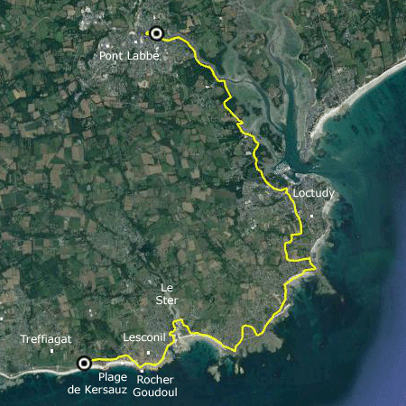Même si, en regardant les photos, je me dis que cette étape n'était pas si mal, je ne crois pas qu'elle restera dans nos mémoires.... Certes, le temps était maussade : pluie fine au départ de Pont Labbé, pluie fine après le pique-nique, un tout petit peu de pluie en milieu d'après-midi (et temps superbe le soir...). Mais surtout, la longue traversée de Loctudy ne présente strictement aucun intérêt : comme c'est une zone urbanisée touristique, l'accés et la vue sur l'océan sont privatisés... Même quand il longe la côte, le GR passe la plupart du temps dans des rues, au milieu de villas modernes, souvent fermées. Oublions vite.... Et retenons plutôt les quelques passages intéressants, comme la descente de l'estuaire de la rivière de Pont Labbé par le chemin de halage, ou le cheminement en bord de mer à la sortie de Loctudy ou autour de Lesconil !