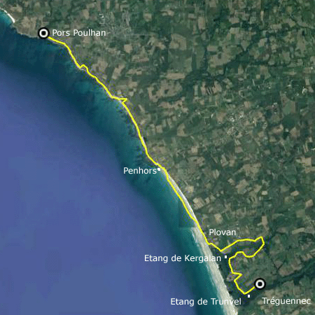 En ce jour où la vitesse autorisée passe de 90 à 80km/h sur les routes, je n'aurais jamais été aussi vite à faire une étape... Mais il est vrai que le point culminant du parcours culmine à 22m... Et comme je suis parti sans mon téléphone, impossible de rajouter quelques détours pour visiter des sites remarquables. Le sentier démarre vers Tréguennec, dans une zone de marais, avec de nombreux étangs. Cette zone est protégée de la mer par un mince cordon de galets qui se brise régulièrement lors des tempêtes hivernales. Après un long détour, on arrive sur une immense plage, d'une platitude impressionnante : les vagues se brisent loin du bord ; la mince pellicule d'eau s'évapore avec la chaleur ambiante. On ne distingue plus le limite de l'eau et du ciel, de l'eau et du sable. Après Penhors, les roches couvertes d'algues réapparaissent derrière de toutes petites falaises ; à l'approche de Pors Poulhan, la nature et la disposition de ces roches changent.