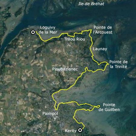 Pour cette étape, nous sommes et nous resterons dans le brouillard, même s'il s'atténuera au fil de la journée. Au départ de Kerity, nous rejoignons la pointe de Guilben, puis contournons la baie de Paimpol, à marée basse, jusqu'à la pointe de la Trinité. Après un paysage de plages basses, nous retrouvons des pointes hautes d'une cinquantaine de mètres, avec des plages de galets. Nous avons ensuite en ligne de mire l'île de Bréhat, toute proche. Nous ne pouvons pas manquer l'embarcadère en raison du monde que nous rencontrons après la pointe de l'Arcouest, puis du grand parking qui suit. Nous filons ensuite plein Ouest vers Loguivy, où nous arrivons avec un temps qui reste brumeux.