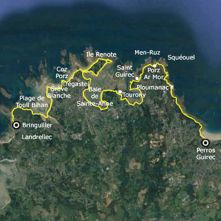 Superbe météo pour cette étape réputée ; d'ailleurs, c'est la seule où nous rencontrerons du monde sur une portion significative du chemin ; d'habitude, c'est juste 100m de part et d'autre des parkings. Mais il faut reconnaître que le paysage est superbe... Nous cheminons toute la journée dans le granite rose, ponctué de quelques plages et petits ports. Les pointes de Squéouel et Men-Ruz en constituent la première attraction, mais l'oratoire de Saint Guirec, le port de Ploumanch et ses moulins à marée sont également superbes. Nous passons ensuite à l'île Renote, méritant également sa fréquentation importante par les promeneurs. Les chaos de granite rose laissent progressivement la place à de grandes plages jusqu'à Bringuiller, terminus de cette magnifique balade.