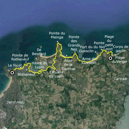 A partir de la pointe de Rotheneuf, où se trouve une cabane de douanier réaménagée en chapelle, un sentier agréable suit de nouveau la falaise jusque l'approche de la pointe de la Varde, terminus de l'étape.