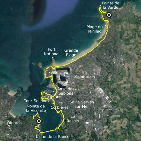 Le temps reste beau toute la journée. La balade démarre bien, autour de la pointe de la Varde. Dès la plage du Minihic, nous goûtons les joies de la loi Littoral en zone urbaine. Nous sommes obligés de suivre une route passante, à l'écart de la mer, les propriétés privées s'étendant jusque l'eau quand la marée n'est pas basse. Comme à Arcachon, une ancienne promenade le long de la plage a semble-t-il été rétrocédée aux maisons longeant la mer, et est maintenant tronçonnée par des murs de parpaings disgracieux. La promenade sur les remparts est superbe, mais très fréquentée. Les goélands se nourrissent sans effort en chipant les sandwichs des touristes non précautionneux... La suite de la balade est heureusement plus tranquille, à l'exception de la traversée de l'impressionnant barrage sur la Rance.