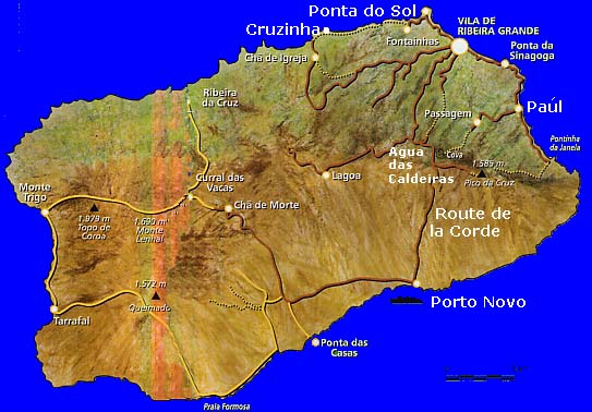 Cette fois, nous partons en voiture jusque Paul, à l'Est de Ponta do Sol, puis remontons jusqu'à la fin de la route qui remonte la Ribeira de Paul, au dessus de Passagem. Le contraste avec les deux autres balades sur Santo Antao est saisissant : nous sommes ici dans une vallée très fertile, grâce à l'eau qui descend du cratère de Cova et qui est canalisée dans les levadas. La moindre parcelle est occupée par des plantations d'ignames, de café, de mangues, de goyaves, de papayes, de tomates, d'haricots, d'oignons et surtout de cannes à sucre.
