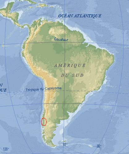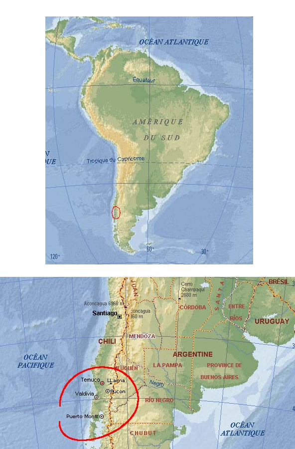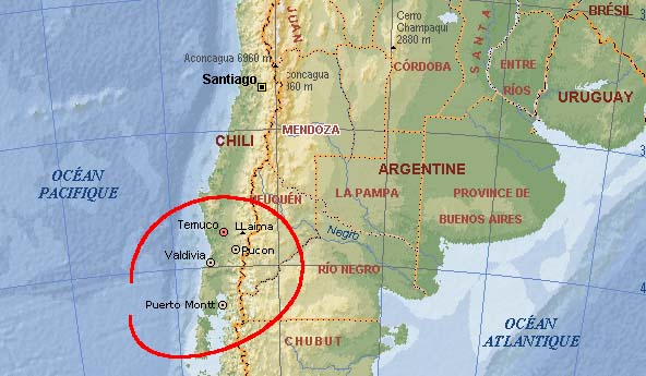 Le Chili s'étend sur 4300km, sur le versant ouest de la cordillère des Andes. Mais sa largeur moyenne n'est que de 180km, ce qui lui donne une fois et demi seulement la superficie de la France, pour une population de 16 millions d'habitants. Le pays compte 2085 volcans, dont 55 en activité. Ils culminent à plus de 6000m dans le nord du pays ; l'altitude baisse jusque 3000m environ jusqu'à la limite nord de la Patagonie, où nous conduira ce périple. Les volcans que nous côtoierons de près (Villarrica, Osorno, Llaima) sont des cônes presque parfaits, recouverts d'une calotte de glace avec de la neige descendant assez bas. Le Villarica fume et rougeoie la nuit ; l'activité du Cabulco ne s'est manifestée lors de notre passage que par des fumerolles, dégageant curieusement une zone de terre sur un sommet recouvert par une couche épaisse de glace et de neige.
