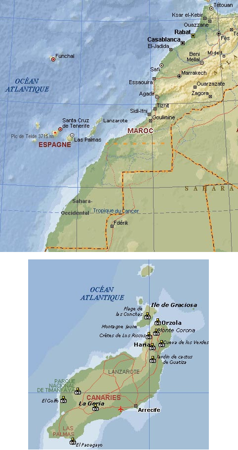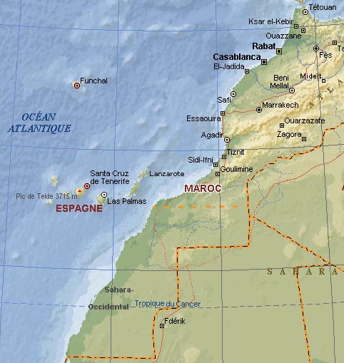 La carte suivante permet de resituer si nécessaire les Canaries par rapport à la côte Africaine.