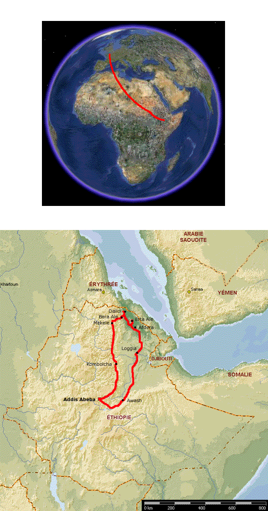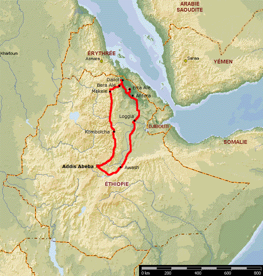 Nous choisissons un voyage organisé par Aventure et Volcans, qui part d'Addis Abeba et non plus de Djibouti, et dont le circuit démarre par la visite du Dallol. Beaucoup plus de trajet en voiture en perspective, mais a priori une chance plus grande de mener à bien l'intégralité du voyage, compte-tenu des relations entre les Afars du Danakil et les Issas de Djibouti.