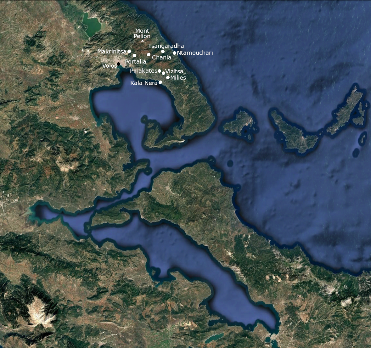 La balade du jour nous conduit d'abord à Pinakates ; de là, nous descendons par un sentier empierré et raide jusque la mer, sur la plage de Kala Nera. Après la baignade, nous allons pique-niquer dans une oliveraie à proximité. Après la sieste, nouvelle baignade, puis le groupe se scinde en deux : les paresseux remontent en bus à Visitsa, tandis que Cléo, Michèle, Elisabeth, Bruno et moi remontons à pied ; le chemin ombragé par des arbres fruitiers monte régulièrement, et traverse le village de Melies, terminus du chemin de fer vers Volos.