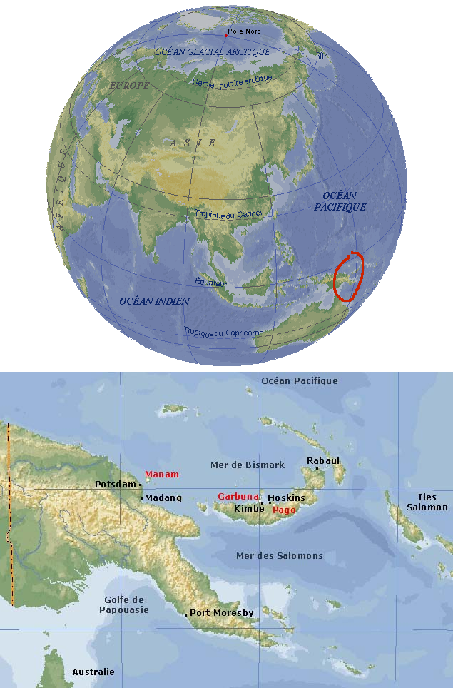 Les 10000 habitants de Manam, dernière étape de notre programme, sont évacués depuis le début d'année suite à l'éruption de fin 2004 qui a fait une quinzaine de victimes ; une nouvelle éruption s'est déroulée le 27 janvier et a tué une personne.