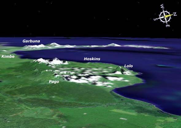 Culminant à 742m, le volcan de Pago domine de 250m le centre de la caldeira de Witori (11km * 6km, avec des parois atteignant 500m), qui date d'environ 3300 ans.