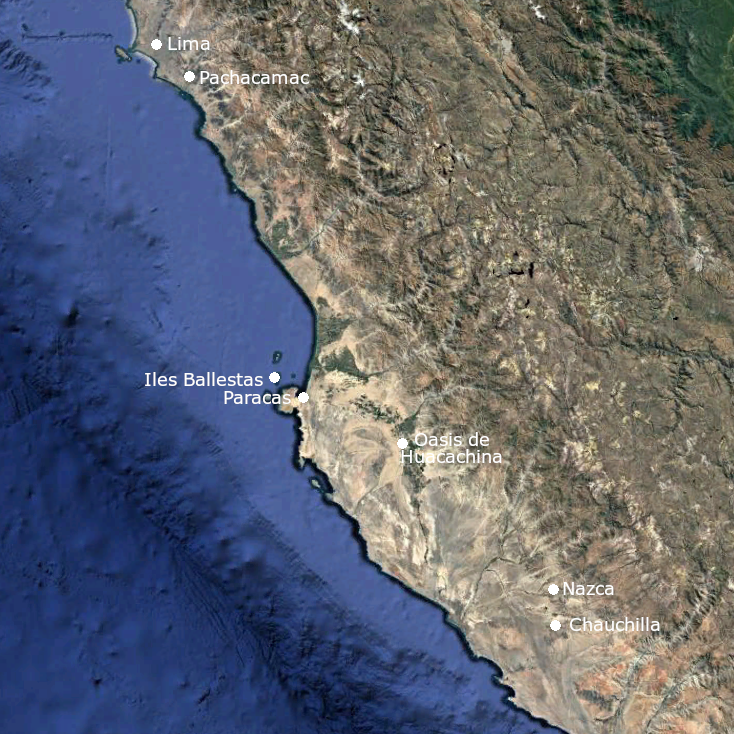 Nous faisons halte à Pachacamac ; dès -1000, ce site était un important centre religieux, qui s'est encore développé sous les huari en 200, puis par les incas. Il se trouve dans une zone désertique, à l'exception des vallées des fleuves qui descendent des Andes. Nous poursuivons ensuite jusque Paracas, petit port qui se trouve en bordure d'une réserve naturelle, que nous allons visiter après le déjeuner.