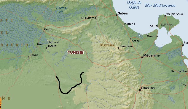 Janvier 1997 : l'avion ou je me trouve avec Michèle atterrit à Djerba, d'où nous partons aussitôt pour Douz. Après une nuit à l'hotel, départ en 4*4 pour le point de départ de cette randonnée de cinq jours de marche dans le sable, où quelques plateaux servent de repère. Quatre chameliers et neuf chameaux accompagnent le groupe, qui comprend 12 personnes et Jean, le guide de compagnie du Sud. La balade se teminera par une baignade dans la source chaude de Ksar Ghilane, avant le retour sur Djerba.